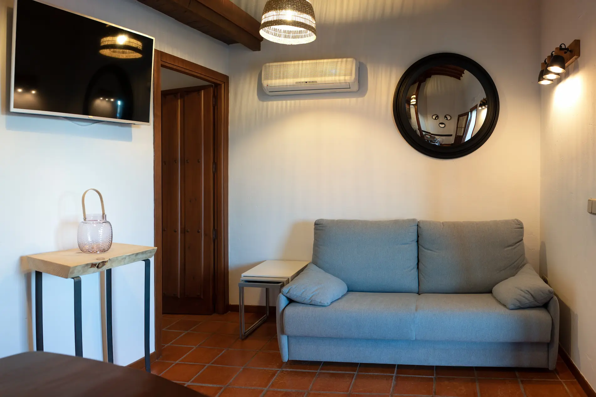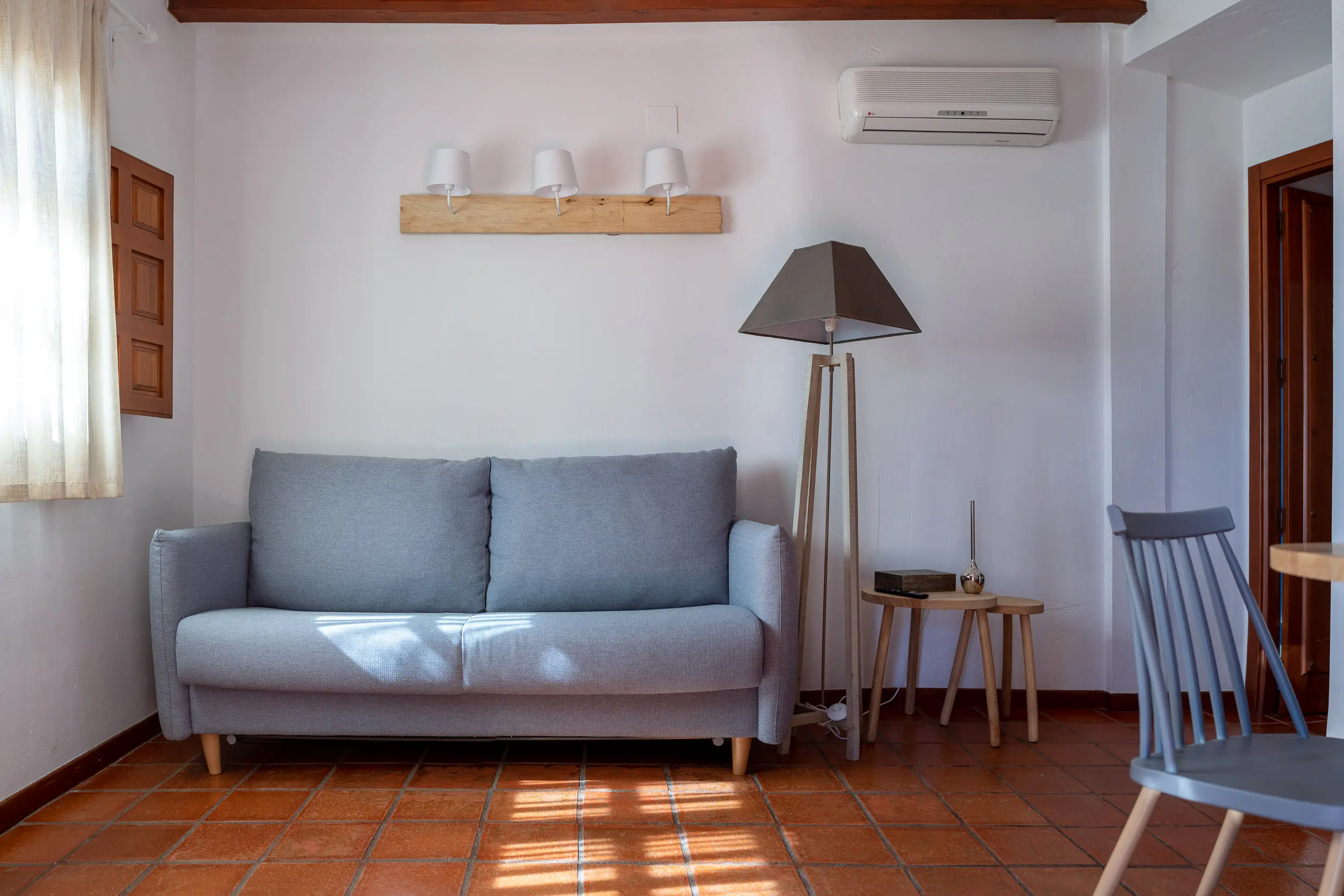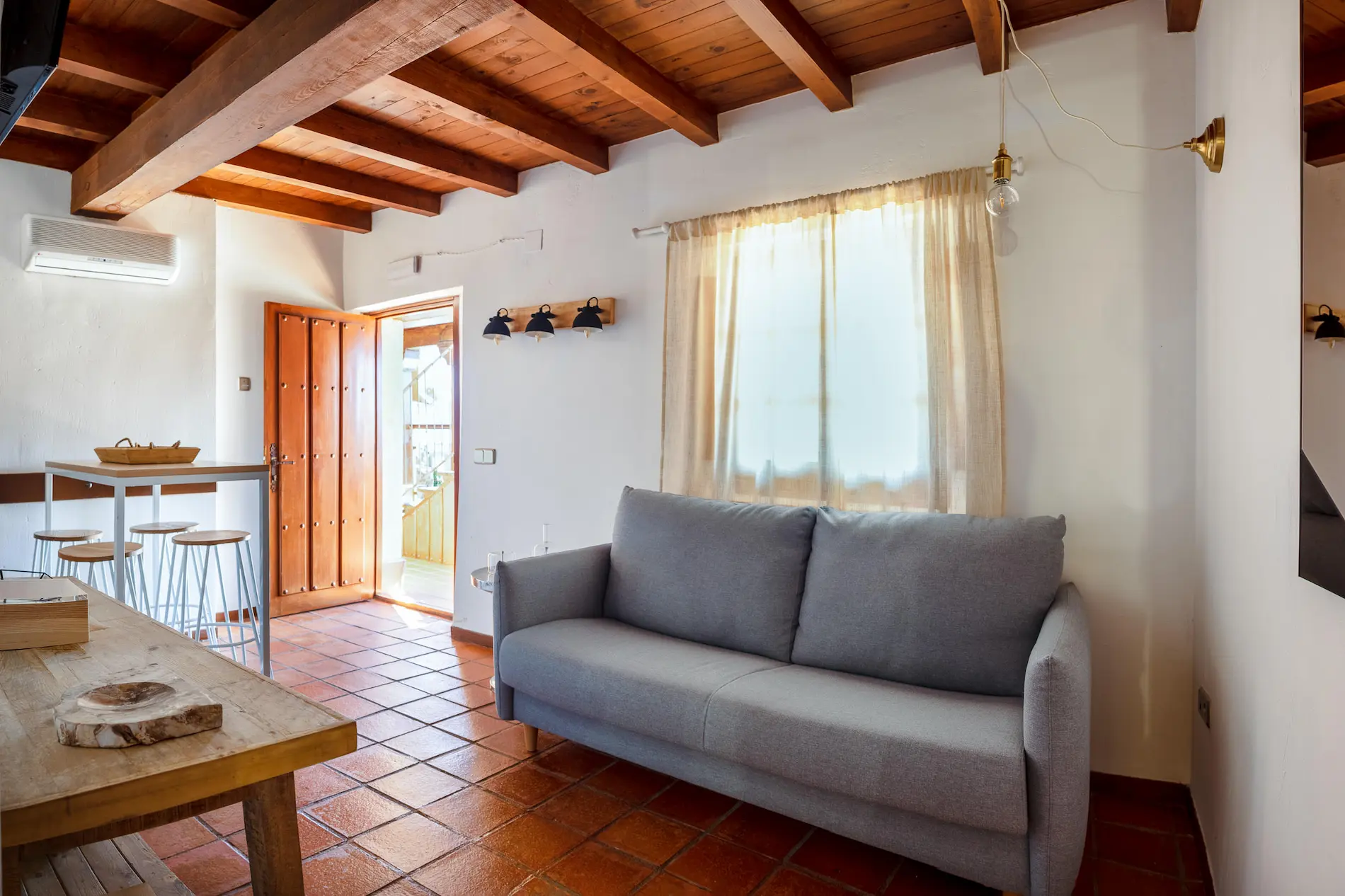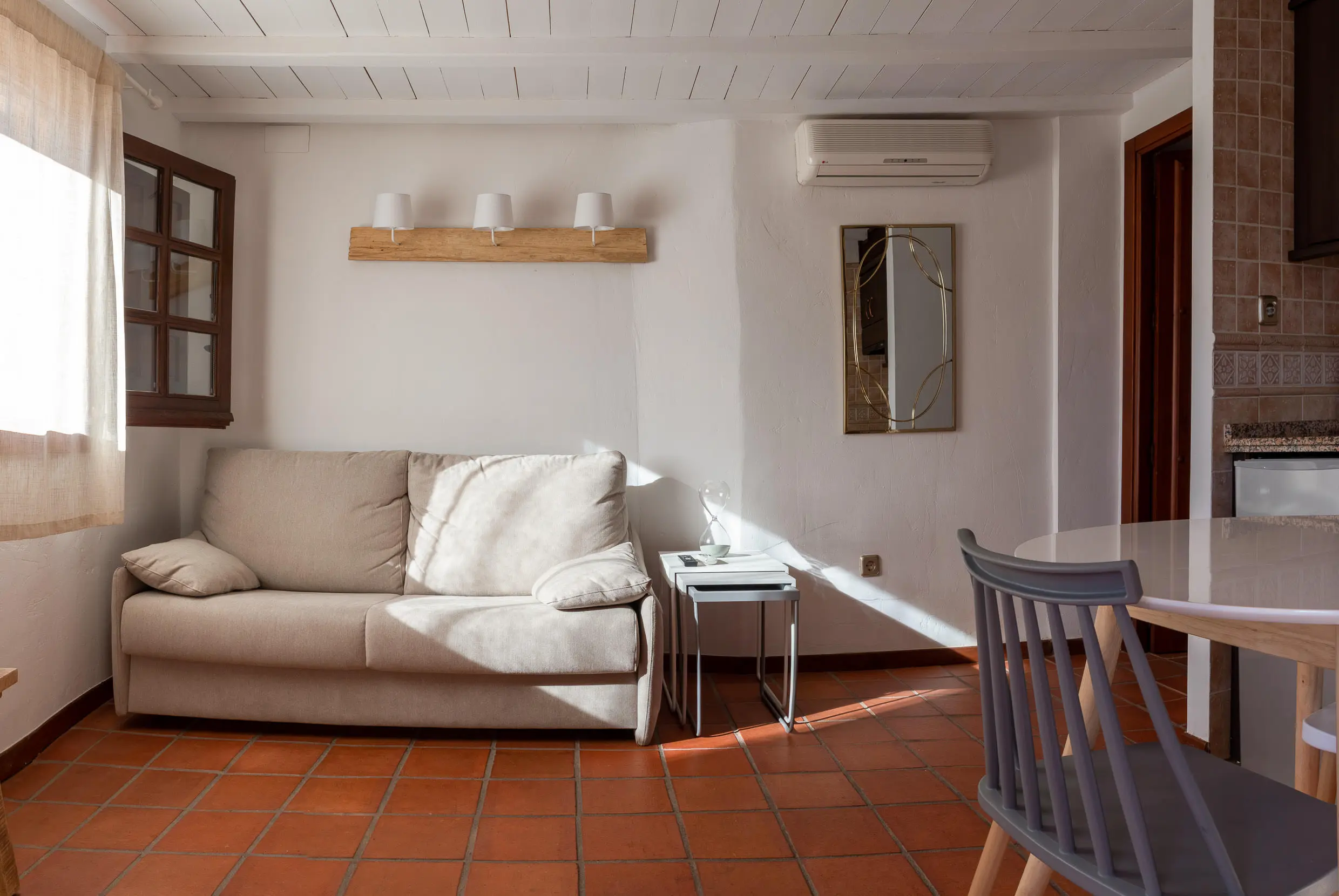 El sofá del salón se convierte en una cómoda cama de matrimonio, ideal para familias y grupos de amigos. En total, el complejo puede alojar hasta 34 personas.